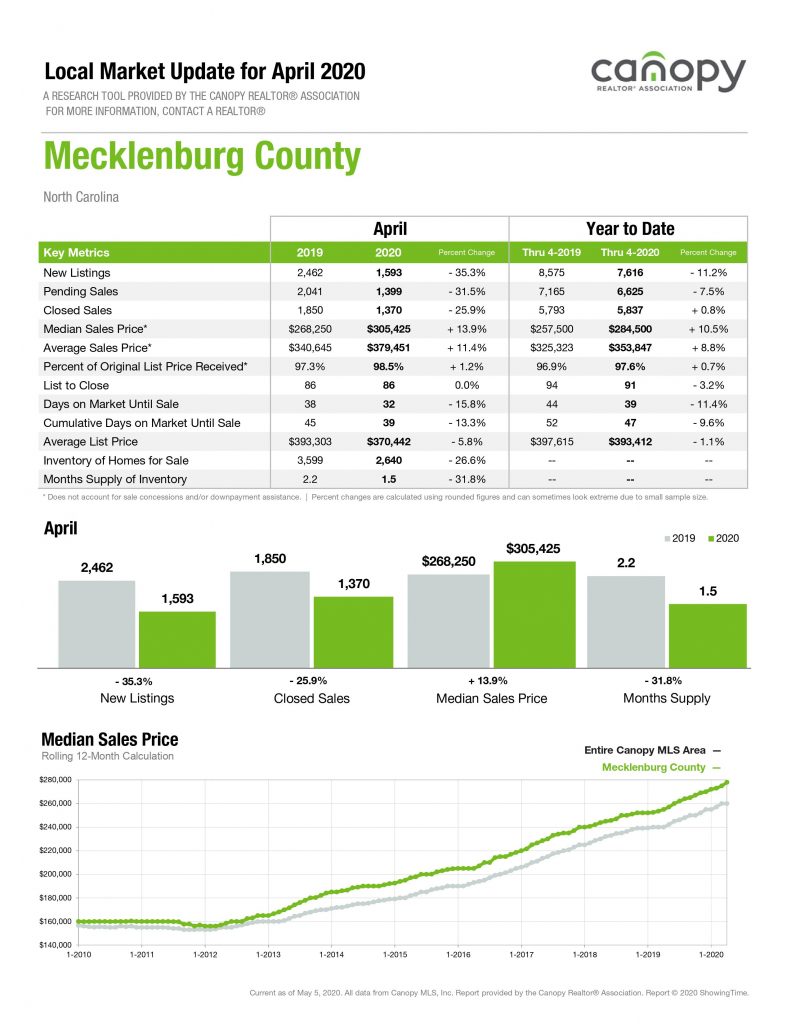 In Mecklenburg County, both new listings and closed sales were down 25-30% from this same time last year. However, with such low inventory – sales prices remained strong at roughly 11% higher than April 2019.